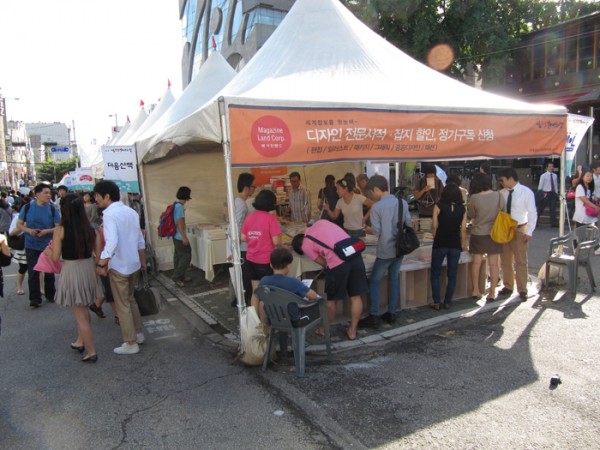와우북 페스티벌을 하면 우선 홍대 주차장 골목 가운데에 흰색 천막들이 쭉~ 들어서서 책들을 판매한다.